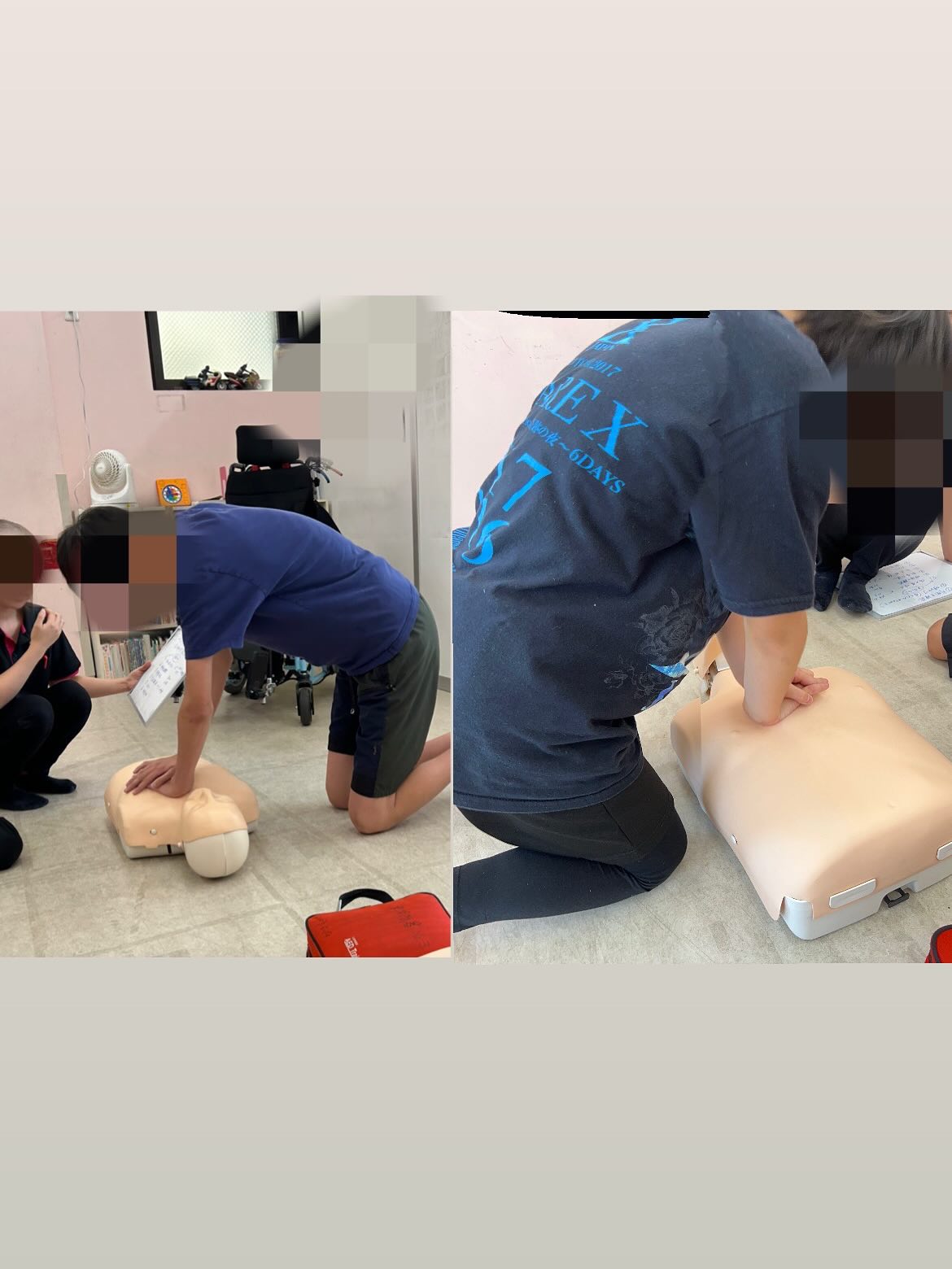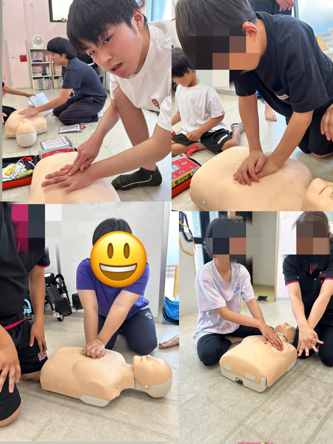 具体的には応急手当てについて話し合ったり、AEDを用いた心肺蘇生の実践練習をしました。